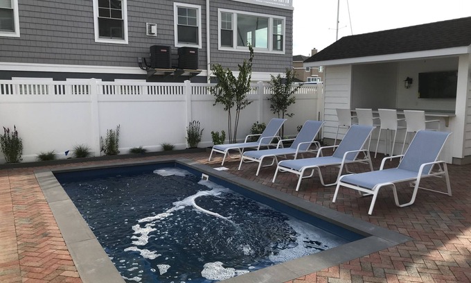 A taste of Nantucket on LBI, welcome to Big Red! A traditional New England Saltbox house set on a quiet street off the boulevard and right on the bay touching Sportsman's Marina with INCREDIBLE water views, you’ll fall in love with the stunning sunsets (with your favorite drink) after a day at the beach! The house is already very well appointed for a terrific week at the beach, but the highlight of your trip will be all of the fun times you and your family will spend in and around the brand new heated salt-water pool and outdoor bar. The landscaping is impeccable and the hardscaping/pavers complete the property. Our home is 2-5 block radius from some of the top restaurants on the island (Beach Haven Fishery, Stefano's, Dockside Diner) and only 10 short blocks to the beginning of other amazing restaurants and attractions (Fantasy Island, Howards, Terrace Tavern, The Black Whale). Mini golf, water-sport & bike rentals, ice-cream shops, deli's & bagel shops also are all around the corner. For the adults, make sure to make your way to the Hudson House on 13th Street at night for some drinks and games - an easy 10 block walk or 2 minute Uber ride. Lastly, even though the house is right on the bay, it is a relatively narrow part of the island where the beach is only a 6-7 minute walk from the house. The Spray Beach Inn is only one entrance over where you can pop in for a bite, a drink or the use of their facilities. If you plan on sticking around on the bay side for the day, you have bay access to drop any kayaks, paddle boards, or a take a quick swim 3 blocks away from the house! To top it all off, if you plan on bringing your boat or renting one for the week, we provide access to dock your boat (up to 26ft) right in the backyard at Sportman’s Marina.