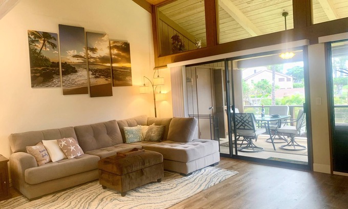 Welcome to our home in paradise! Start or end your day on the large peaceful (newly renovated) lanai - complete with wet bar and wine fridge - with a view of the golf course, pool area, and peek-a-boo ocean views. During our visit this summer, we replaced the wetbar, including new cabinetry, countertop, sink and backsplash:) We also updated the decor!