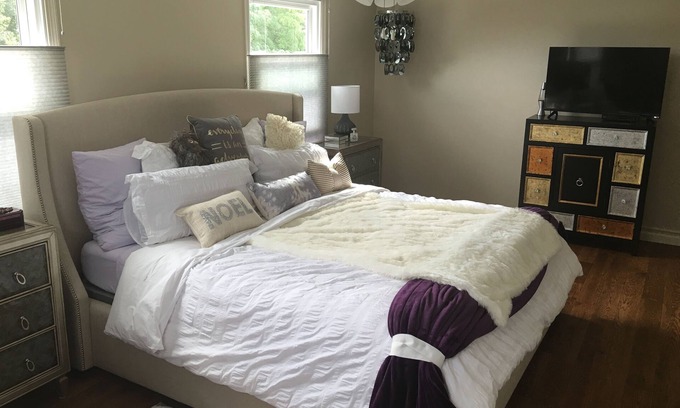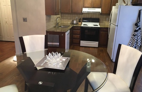 Quiet, Serene neighborhood. Freshly painted - neutral, All hardwood floors throughout - beautifully appointed, all new furniture and bedding. 65” screen TV in living room, 45” screen TV in Master bedroom. Comfy sofa and lazy-Boy recliner, and very comfy king size bed in master, comfy queen size in 2nd bedroom. 2 floor end unit townhouse. Stone countertops in kitchen and bathrooms. Fully equipped kitchen, excellent lighting and ceiling fans, central heat (gas) and A/C. Very spacious, open, clean and enjoyable.
