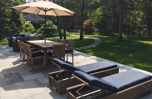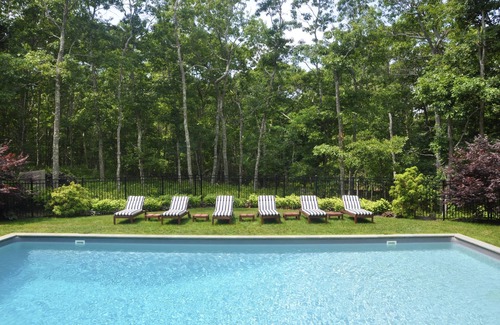 This completely renovated and professionally decorated home provides the perfect summer retreat. Sitting on three peaceful acres, the expansive south-facing backyard features a large bluestone patio for entertaining and a heated 40'x20' pool (completely fenced in for children), all bordered by a private reserve. The interior features a bright, open floor plan, perfect for entertaining, with a property-wide stereo system, double-height living room with exposed beams, chef’s kitchen, breakfast bar and dining room. Lots of windows throughout flood the home with natural light. Four well-appointed bedrooms, including two masters, each with its own en suite full bath, feature designer bedding and ample closet space. One of the queen bedrooms can be configured to also include a crib. A finished basement has second large TV/playroom area with a pullout couch and additional storage. Located a few minutes drive from Southampton Village, ocean beaches and golf, this home has it all.