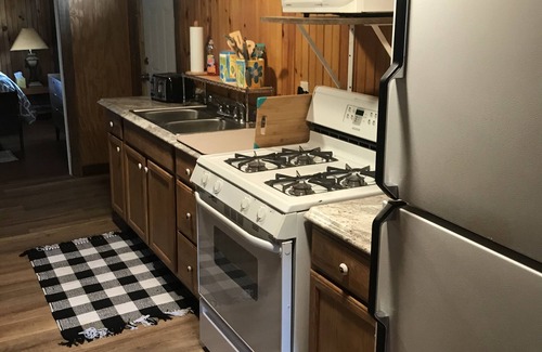 Once you step inside the cabin you'll see and feel "Country". There's pine ceilings and a custom made island for sitting around and discussing the days events or for just sipping coffee first thing in the morning. The island is adorned with drift wood and wooden limbs from our property behind the cabin, which gives the cabin a very rustic, and comfortable feeling of relaxation. This replaces a traditional kitchen table and chairs in the cabin.