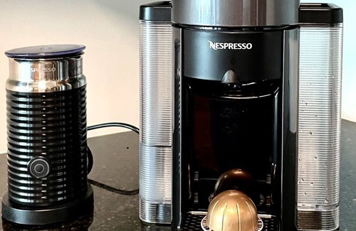 - drip coffee machine as well as a Nespresso Vertuo coffee machine and heated milk frother for lattes and espresso.