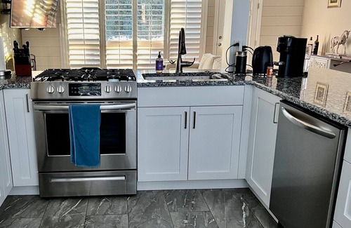 Beautiful open kitchen space with lots of light, modern shutters and a living room with fire place and TV. This house will make you feel right at home. The master bedroom has a connected full bathroom with a very comfortable king sized bed. On the 1st level is also a bedroom with a queen sized bed as well as an office. In the hallway the 2nd full bathroom is situated. The Basement has a spacious living area and separate bedroom with a queen sized bed, another bedroom with a twin sized bed and the 3rd full bathroom.