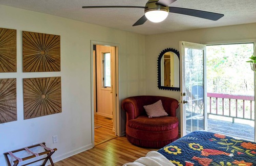 Bedroom 1 has a king bed with a Sleep Number mattress, a full bathroom en suite, and access to a small outdoor deck.