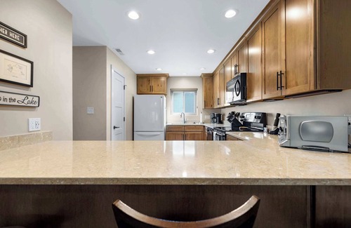 Step inside your newly renovated private getaway and feel instantly at home. The open-concept kitchen features sleek stone countertops, a Keurig and drip coffee maker for your morning pick-me-up, and counter seating for three—ideal for chatting over snacks or planning the day ahead. The adjacent dining table seats four and is the perfect spot for family dinners, puzzles, or late-night card games. Flowing into the living room, you’ll find comfort in every corner: a cozy couch, oversized char, two recliners, and a smart TV for movie nights or streaming your favorite shows. A fireplace adds warmth and ambiance for cooler evenings, while a selection of board games invites playful downtime. As sunlight pours in through sliding glass doors, step out onto your screened-in private balcony to enjoy stunning lake views. A high-top table for two and additional seating create a peaceful perch for your morning coffee or evening glass of wine as the sun dips below the horizon.