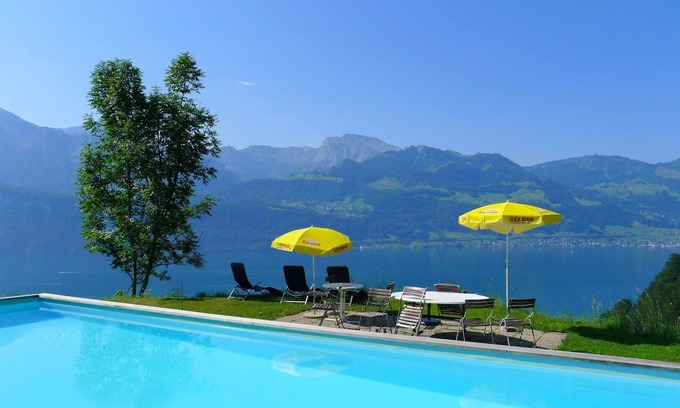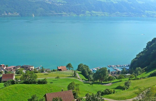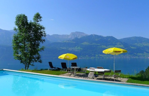 Apartment block "Platten". Outside the resort, 1.5 km from the centre, in a quiet, sunny position on a slope, 1.5 km from the lake. For shared use: lawn for sunbathing, swimming pool (4 x 12 m, seasonal availability: 01.Jun. - 30.Sep.) with internal staircase. In the house: restaurant, lift, central heating system, washing machine, tumble dryer (for shared use, extra). Motor access to the house (mountain road). 4x4 car recommended in winter. Parking at the house. Grocery 1.5 km, restaurant 10 m, bus stop "Gersau, Platten" 50 m, swimming bay 1.5 km. Tennis 1.5 km, mountain railway 4 km, ski lift 4 km. Well-known lakes can easily be reached: Vierwaldstättersee 1.5 km. Please note: car recommended.