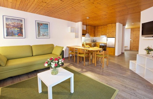 The vacation apartment is located in the Hotel Schweizerhof and has a quiet, idyllic location with a balcony offering a nice view. It is a 2½-room apartment with a separate bedroom, a living room that can accommodate two additional people, and an open kitchen. The total living space is 55 square meters. The apartment also includes a parking spot in the underground garage and access to a ski and snowboard room.