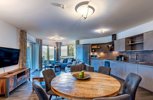 The apartment block features several convenient amenities for guests' comfort, including a lift, storage rooms for bicycles and skis, a central heating system, and a ski boot dryer. It also offers roofed parking on-site and an E-charging station. Nearby, you'll find a supermarket within 2 kilometers, a restaurant at 200 meters, and a bus stop and railway station just 300 meters away.