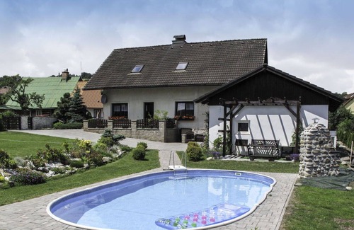 Cosy, comfortable 2-family house "Vrchlabí". In a quiet position, 10 m from the river, in a cul-de-sac. Private: garden 400 m2, swimming pool heated (9 x 3 m, depth 120 cm, seasonal availability: 15.Jun. - 15.Sep.). Terrace, garden furniture, barbecue. In the house: sauna (extra). Massage (extra). Parking at the house. Shop 200 m, grocery 100 m, supermarket, restaurant, bus stop 200 m, railway station 1 km, outdoor swimming pool 3 km, indoor swimming pool 14 km. Golf course 16 km, tennis 3 km, mountain railway 1 km, ski lift 1 km, ski school 1 km, sled run 14 km, cross country ski track 3 km, children's playground 300 m. Please note: the owner lives in the same residence. The owner has a dog.