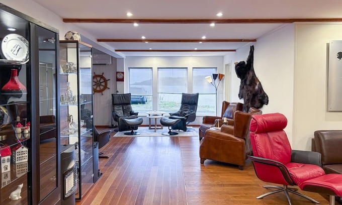 This spacious and comfortably furnished holiday home is located directly on the water and offers nature lovers and fishing enthusiasts a cosy retreat to pursue their passions in a larger group. Conjure up energising dishes together and chat about your experiences over a cheerful meal. After a long day in the fresh air, you can relax your tired feet on the armchair or get together for a film evening.