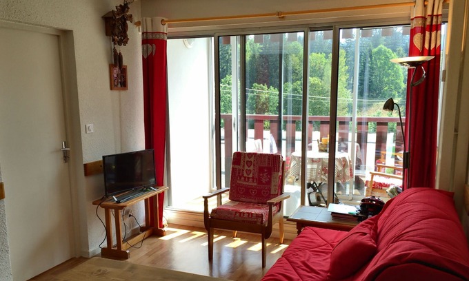 Apartment of 32m2, two rooms in very good condition and well arranged, four beds (two single beds of 90cm) in the bedroom and a double convertible sofa 140cm), with balcony-veranda facing south-east with view of the Dôle. Kitchen area, toaster, microwave, TV. Parking, heated swimming pool, (open July and August) and tennis court.