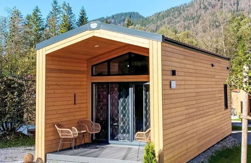 The "Tiny Haus Glockenalm-Haus Puppenkiste" is a 3-room mobile home spanning 33 square meters across two levels, suitable for accommodating up to two adults and three children. The living/dining room is tastefully and cozily furnished, featuring satellite TV and air conditioning for your comfort.