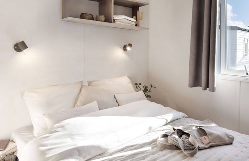 "6 persoons", 4-room mobile home 32 m2. Comfortable furnishings: living/dining room with dining table and flat screen. Exit to the terrace. 1 double bedroom with 1 double bed. 2 double bedrooms, each room with 2 beds. Open kitchen (4 gas rings, microwave, electric coffee machine). Shower, sep. WC. Heating. Terrace. Terrace furniture. Reserved parking at the house. Please note: non-smoking house. Maximum 2 pets/ dogs allowed. Smoke alarm. When you bring a pet an additional cleaning fee of € 10 applies on top of the pet's costs, to be paid on spot.