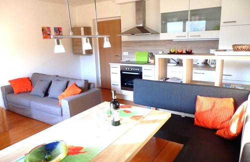 The apartment on the beautiful Presseggersee has a spacious bedroom for a family and a south-facing balcony. The furnishings are modern and stylish. The bedroom has a double bed (box spring) and a bunk bed. The living room is equipped with a sofa, a modern armchair and a flat screen TV with satellite receiver. The dining area has an extendable dining table with a corner sofa and two chairs. The kitchen is fully equipped with a dishwasher, oven, refrigerator with freezer compartment and also, among other things, a coffee machine, kettle, toaster and a good set of chef's knives for the hobby chef. The spacious bathroom with a walk-in shower has a rain shower with additional hand shower, a towel dryer and underfloor heating. The toilet is separate. The balcony can be reached from the living room via patio doors. From your private balcony you have a fantastic view of Lake Pressegger and the peaks of the Carnic Alps. Garden chairs and table are available. Pets on request!