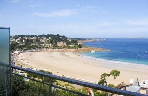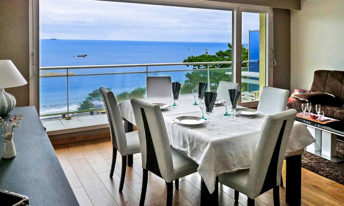 - A large living room with sitting area (sofa bed) and dining room. The large bay window opens onto a balcony (with a small table and chairs) which runs alongside the apartment with a breathtaking view of the beach of Trestraou in Perros-Guirec. All the necessary equipment is present: a flat screen television,