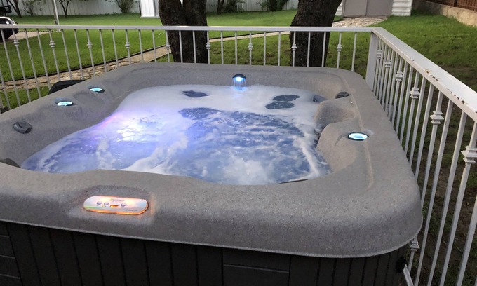 ^ Amazing Hot Tub on the back patio under huge shade trees overlooking huge green backyard!