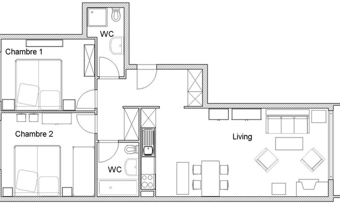 Les Mélèzes is located at the entrance of the resort, at the 1800 level of Les Collons. It is 900 metres from the cash desk and the Trabanta chairlift, and is directly served by the shuttle bus from Les Masses to Thyon 2000 in winter, so you can spend your entire stay without using your car. It is also accessible by ski for good skiers. The common areas include a meeting and reading room, a games room with billiards, table tennis and table football, a heated indoor swimming pool and a sauna. You will be asked to respect the tranquillity of the premises. The building also houses the parish hall where mass is held at 5pm in winter.Nearby:bus stop: 10 metressports shop: 50 metrestourist office: 30 metreschapel of Les Collons: 10 metresplayground / ice rink: 50 metreschairlift: 900 metressupermarket: 900 metrescash dispenser: 850 metresbakery - tearoom: 700 metresExternal communal parking spaces (CHF 35.-/week) or garage spaces in the building (CHF 84.-/week) can be booked at the agency (subject to availability). -- Living room / Dining room. Open plan fitted kitchen. 1 WC / Bath and 1 WC / Shower. One bedroom with 2 single beds and one bedroom with 2 single beds and 1 bunk bed. Balcony of the living room facing east, sunny in the morning, with a view of the Val d'Hérens (Valley) and the mountains including the Maya, the Dent-Blanche and the Matterhorn, balcony of the bedroom facing west. -- the final cleaning,bedding and towels,rental charges and administrative fees. -- -- -- Final Cleaning: A final cleaning is included in the price. A supplement may be charged in case of abuse. -- -- Available Kitchen Towels: Included in the price -- -- Available Bath Towels: Included in the price -- -- Bedsheets: -- Included in the price -- -- Parking: Communal parking space are available at a cost of CHF 35.- (free in summer) -- -- Caution: A deposit of CHF 500.- (credit card) will be required from the tenant (payable in advance). -- -- Cancellation Insurance: It is advisable to take out cancellation insurance in case of force majeure. -- -- Administrative Costs: Included in the price -- -- Pets : See the description of the accommodation -- -- Tourist Tax: Tourist taxes are not included. Adult : CHF 3.20 / night ; Child : CHF 1.60 / night --