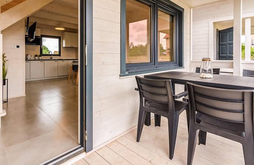 Step out onto the covered terrace and enjoy your meals outdoors. The small wooden houses are arranged in neat rows and offer you a sheltered retreat. The garden area with lawn is perfect for playing or relaxing. Watch your children at play. There is a playground right on your doorstep.