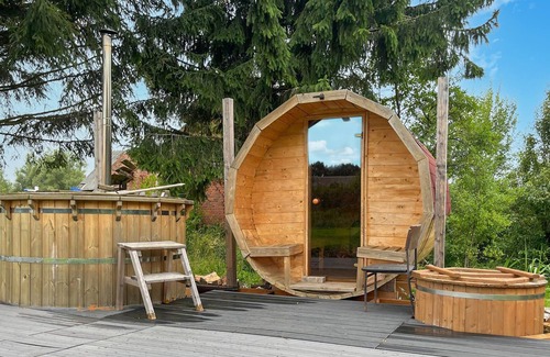 Pure idyll welcomes you to this beautiful wooden house with barrel sauna and whirlpool.