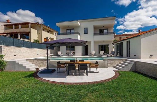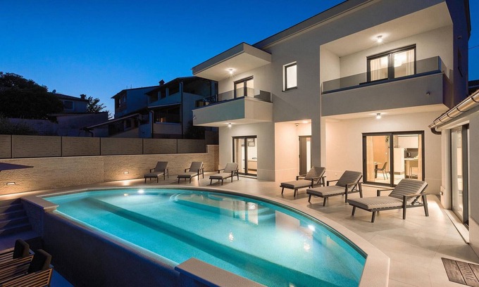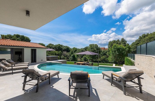 Villa Cascada is located in the small town of Munti on the outskirts of Pula and only 5 kilometres from the international airport. It offers you easy access to the city and at the same time a multicultural experience at your fingertips. Enriched with a modern interior and exterior and a touch of Istrian rusticity, the villa offers you an ambience that will take your breath away! It was built in early 2023 and is now ready to open its doors to guests looking for a luxurious and peaceful holiday with friends or family. You will stay comfortably in 3 double bedrooms (one of which has two single beds that can be put together if desired). Each bedroom has an en-suite bathroom with fully equipped shower cubicles. Guests also have access to a washing machine, tumble dryer and ironing facilities. In the spacious living room there is a three-seater sofa with queen-size bed, LED TV and modern details. It is of course important to mention that the kitchen has an impressive view of the greenery through the sliding glass walls! The kitchen is fully equipped and furnished with minimalist touches that facilitate the preparation of a light lunch as well as a rich dinner, which is indeed a tradition in Istria. In front of the villa there is a beautiful swimming pool, also enriched with greenery, where you can find cooling shade during the summer heat or enjoy the Istrian sun on the sun loungers by the pool. In addition to the swimming pool, this villa offers a relaxing wellness area and an outdoor whirlpool. In the shade of the palm tree you will find a children's playground with a slide and swings, as well as a gas barbecue for outdoor cooking. Villa Cascada offers you relaxation for body and soul, while the enchanting village of Muntic will delight you with its distinctive Istrian ambience. Villa Cascada is located in the village of Muntic in the municipality of Liznjan in south-east Istria. This colourful village has a rich history dating back to Roman times. It was first mentioned in the 14th century and the current Gothic-style church of St Jerome was built in the 16th century. Get to know the charming local people and their home-made products, which you can use to prepare Istrian dishes. Traditional singers and musicians from Muntic will entertain you. Visit the tourist centres of Medulin and Pula. Medulin is an old fishing village and a modern tourist centre. Explore the sandy beaches on the southern coast of Istria and sample the traditional cuisine of the region in restaurants and taverns. For adventurers, there is an adrenaline park, while history lovers can visit the Vizula Archaeological Park, the historical park of the municipality of Medulin. Set sail for the islands of the Medulin archipelago Ceja, Levan or Bodulas. You can also explore the charming village of Marcane. In the immediate vicinity of Marcana is Duga Uvala, where you can enjoy the 300 metre long beach. You can explore the underground of the Marcana Riviera in the Ljubic Cave, the Golubinka Cave or the Peresin Cave. Pula is definitely an unmissable destination. In the largest city in Istria, you can visit the Pula Amphitheatre, the Temple of Augustus, the Golden Gate and many other cultural and historical monuments. Enjoy the beautiful beaches and breathtaking scenery.