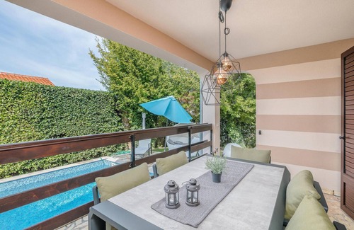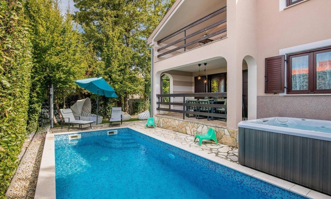 This friendly vacation house is located in the former fishing village of Njivice on the island of Krk, which has matured into a prestigious vacation resort. The house is located in a quieter part of the village, but still not far from the center and beaches. On the ground floor of the main house are the living area, as well as two bedrooms. A steep staircase leads you to the attic, with the lowest ceiling height of 80 cm, where there is another bedroom and a bathroom. In the basement you can spend sociable hours in the lounge. On the fenced property there is a small bungalow with a small kitchen, bathroom and living room. Refresh yourself in the swimming pool and relax while sunbathing while your children play.