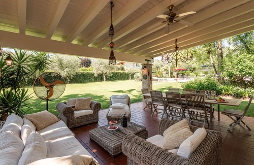 This elegant holiday home is located in a park with olive trees and a large pool just 200 metres from Lake Garda and a 10-minute walk from the small village of Padenghe. You can easily reach a nearby beach with restaurants and boat hire via a road subway. For sporting activities, there is a riding school, a golf course and cycle paths in the surrounding area. Your beautiful holiday home is spread over two floors: on the ground floor there are three living rooms and a dining room with a natural stone fireplace, a kitchen, a guest WC and a gazebo with a barbecue. On the first floor there are four double bedrooms, one twin bedroom and three bathrooms. One of the double bedrooms has a private bathroom and sauna. The pool has a whirlpool corner, counter-current swimming and a changing room with bathroom. A laundry room is accessible outside the house. In the park there is a fenced green area with a wooden kennel for your dog. Safe and covered car park available. Additional cleaning is available on request and for a fee on site. Lake Garda offers a variety of attractions in the areas of music, theatre, enogastronomy, sport and art in addition to well-known amusement parks. Arrival only 16 - 20 o'clock.