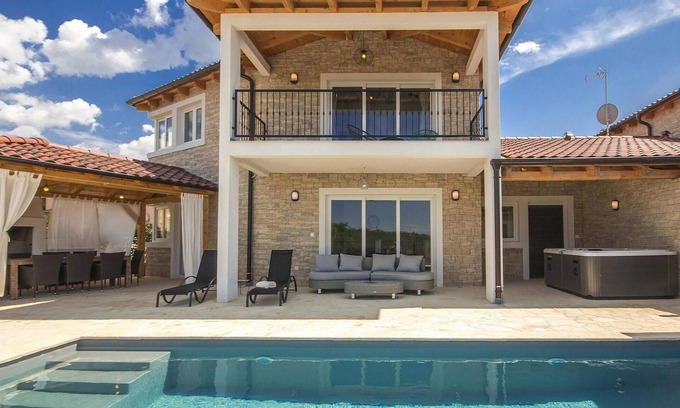 This beautiful villa has a lovely private pool, an outdoor jacuzzi and a sauna - everything you could want for a relaxing vacation! Relax on the sun loungers next to the pool or enjoy a meal from the barbecue in the dining area right next to the pool. Villa Vespera will delight you with its tastefully furnished interior. On the first floor there is an open space divided into a fully equipped kitchen with dining area and a spacious living room. On the first floor there is one of the four beautifully furnished bedrooms with en-suite bathrooms and the sauna. The remaining three bedrooms and bathrooms are located on the upper floor. All bedrooms are air-conditioned and have a TV. Enjoy your morning coffee with a light breeze and a beautiful view from the terrace on the upper floor of the villa. Book Villa Vespera and spend a fabulous vacation near Porec.Located in the quiet part of Porec, but only a short drive from the city center, this villa is ideal both for those who prefer a relaxing vacation and for those who like the hustle and bustle of tourist cities. In Porec you will find all kinds of activities, restaurants, bars and clubs. As Porec used to be a Roman colony, the city is especially known for its rich cultural heritage. The breathtaking Euphrasian Basilica, under UNESCO protection, is the best proof of how glorious the history of Porec was. Medieval towns of Motovun and Groznjan as well as the coastal towns of Rovinj and Versar are only a short drive away from the villa. If you are interested in more distant parts of Istria, the Brijuni Islands and the Roman amphitheater in Pula are easily accessible from this region.