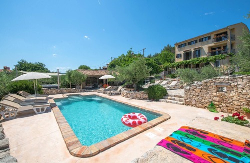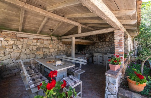 This beautiful Mediterranean villa is located in Rabac, which is known for its beautiful pebble beaches, with crystal clear sea as well as the view of the Kvarner Bay and islands. The house is located on the outskirts of the town on a hill, in green surroundings with Mediterranean vegetation and olive sharks, which the landlord grows. The house is furnished in authentic Istrian style, with beautiful wooden furniture and many details. Each room has its own bathroom. Two bedrooms each are located on the first and second floor. A small road separates you from the pool and leads to the last house. Next to the pool there is also a semi-open summer kitchen with wooden benches and a table, so you can have your dinner outside. Nearby there are also several restaurants that offer fish specialties. In the center of the village there is a long promenade with ice cream parlors, restaurants and much more. Active vacationers can look forward to tennis courts, mini-golf, cycling and hiking trails.