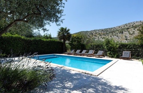 In the hinterland of Dalmatia, in Srinjine, near Split, in an idyllic setting, stands this vacation home. The rooms are pleasant, and in the fenced garden with pool also a summer kitchen provides additional comfort. In addition, there is entertainment for children. Outdoors, children and pets can play carefree while you prepare delicious meals. Visit the nearby towns of Split and Omis, which offer a wide range of cultural and historical sights as well as summer events, while the more daring can try their hand at adrenaline sports in the Cetina Gorge with Radman Mills.