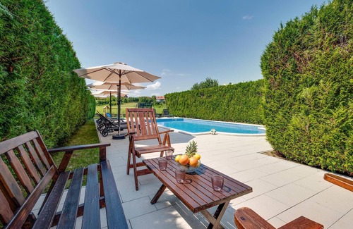 Immerse yourself in the peace and beauty of the Croatian countryside and leave everyday life behind you. Start your day with breakfast on the cosy terrace. Afterwards, refresh yourself in the spacious outdoor pool or relax on one of the comfortable loungers. The peaceful surroundings invite you to linger and ensure absolute relaxation.