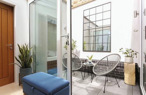 Step into a light-filled glass entrance, where you can gaze up at the trees, sky, and stars above. From here, access the charming outdoor courtyard, a peaceful nature spot with seating for two.