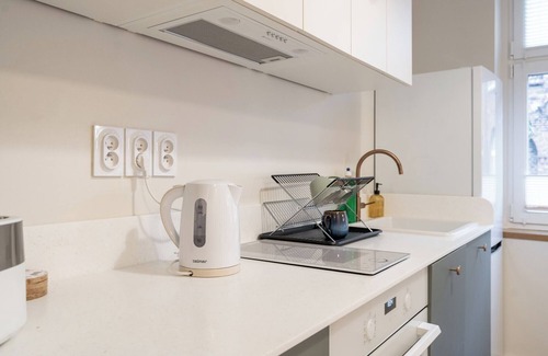 Nikiszowiec Deluxe Studio is a stylishly furnished apartment featuring a living area with a sofa bed and a kitchenette, as well as a bathroom. Guests can enjoy various amenities, including free WiFi, a TV, a washing machine, a hairdryer, a dishwasher, an induction cooktop, an oven, a refrigerator with a freezer, a toaster, a kettle, and kitchen utensils.