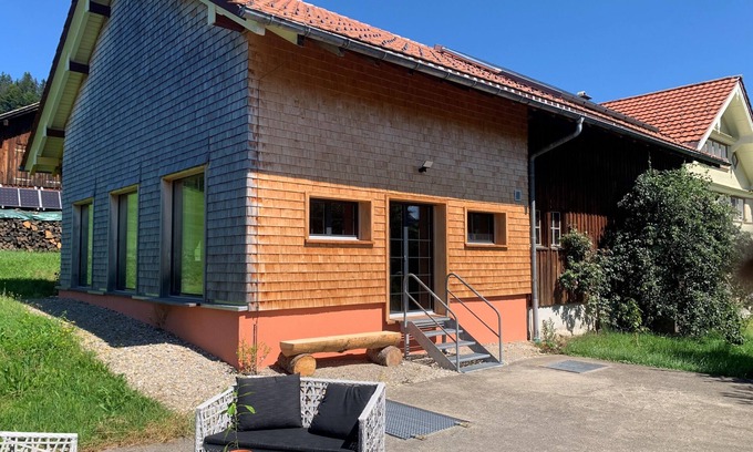The spacious, loft-like studio (ceiling height 2.90 m) built into the former stable - as a separate part of the house with its own outside entrance and terrace access - offers a wide view of the countryside through its three panoramic windows (no immediate neighbours) and of the starry sky at night. Our farmhouse is within walking distance of the village on the outskirts with a beautiful view of the village of Schönengrund and the surrounding area. At the rear, with a view of the Way of St James, you feel as if you are on an alpine pasture and yet you are within walking distance of the bakery, butcher's, grocery shop and country shop. You can also retreat to our forest with stream during the day. If you are travelling on the Way of St. James, you can reach us on foot in 15 minutes. If you are travelling by public transport, we will be happy to pick you up at one of the stops.