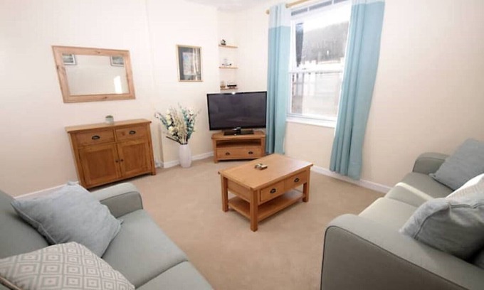The apartment is situated on the first floor .(PLEAE NOTE MUST CLIMB STAIRS TO ENTER PROPERTY) . The spacious lounge includes 2 comfortable 3 seater sofas with a 43inch smart TV (guest must use own login)and a selection of books and is decorated in a light and airy style. The kitchen is well equipped with a hob, oven, microwave, kettle, toaster and dishwasher. On the second floor the newly renovated bathroom has a good sized shower. Towels are provided for your convenience. The first bedroom has a king-size bed, a comfortable armchair, chest of drawers and hanging space. The second bedroom contains twin beds, chest of drawers and hanging space. All bed linen, pillows and duvets supplied.