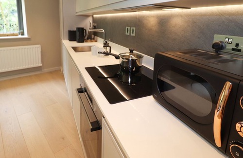 This contemporary first-floor apartment rests in Backbarrow, Cumbria and can sleep two people in one bedroom.