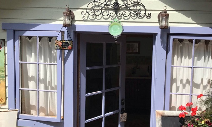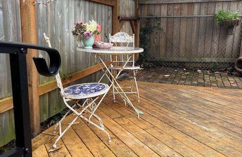 The cottage has it's own private gated entrance and ground level deck with Adirondack chairs, a propane fire pit stove is available upon request , a breakfast table and chairs, and a small gas barbecue if requested. You are also welcome to use our barbecue that is around the corner on our deck. You will enter from close by parking, just off the street through the purposely indescript private gate onto the cottage private deck at ground level. Step two stairs down into the cottage.