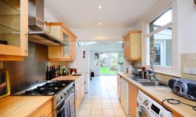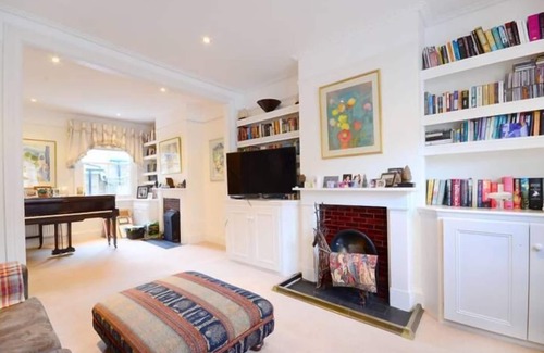 The house itself has 2 large double bedrooms and one small double, & an extra sofa bed downstairs; also a luxury very pretty bathroom with bath, power shower & 1 loo. A 2nd loo downstairs. Double drawing room with grand piano, large HD 3D TV, and large open kitchen/dining area opening onto 40' x 16' garden. Highly sought after but quiet street.