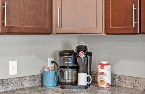 Offering tons of counter space, the kitchen comes fully stocked with a variety of ingredients, tools, and storage options to make cooking a breeze. The cabinets and drawers are packed with all the cookware, tableware, and flatware essentials you'd need for any meal. Wake up to a freshly brewed cup of coffee; a Keurig, coffee pods, creamer and sugar are included.