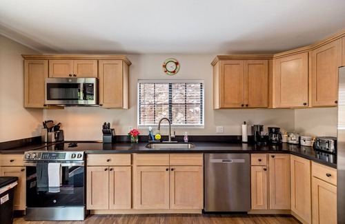 -Fully stocked kitchen with stainless steel appliances and coffee bar.