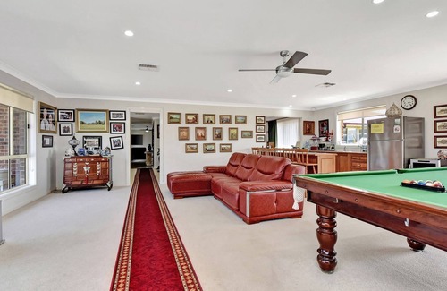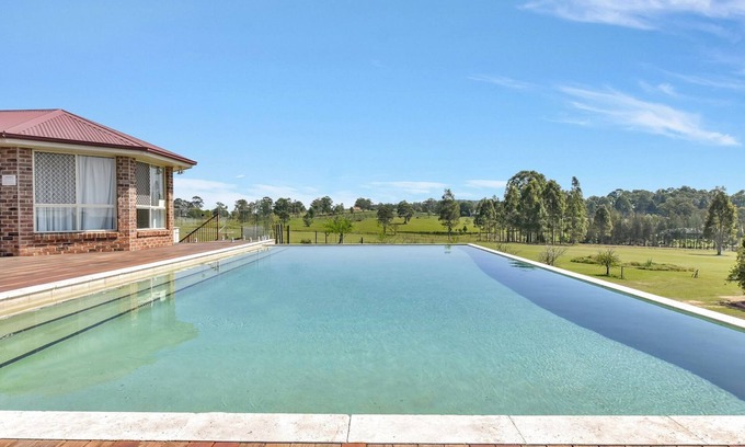 Located in the boutique Lovedale wine region, this grand residence blends timeless elegance with modern comfort. The homestead features a spacious, fully equipped country kitchen, formal dining and sitting rooms designed for entertaining, and a generous games room complete with pool table and darts. A cozy combustion fireplace adds warmth in the cooler months, while the showstopping infinity-edge pool invites you to relax and unwind in the summer sun.