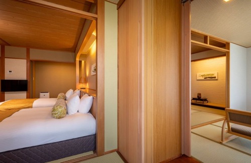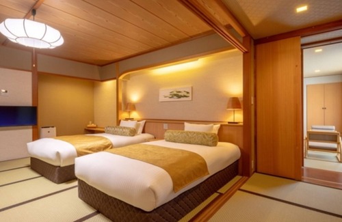 A connecting room with a Japanesestyle room with futon and another Japanesestyle room with two beds