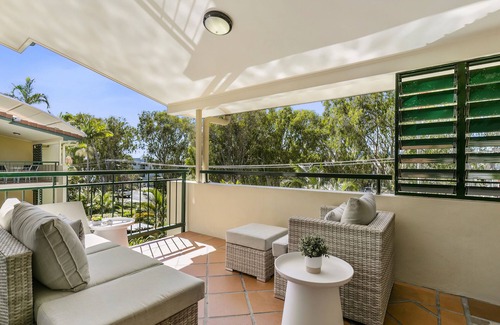The apartment features a newly renovated kitchen with quality European appliances. The open-plan dining and living room flows out to the private balcony with views over the main pool and glimpses of the sparkling Noosa River and Weyba Creek.