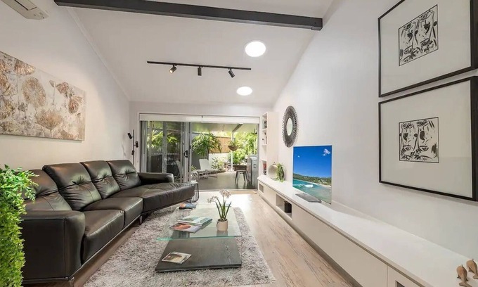 Experience open-plan living in this stylishly furnished space equipped with modern comforts including air conditioning, unlimited free WiFi, and a smart TV with Netflix. Enjoy the added luxury of a Sonos Bluetooth speaker for playing soothing background music. This comfortable single level space conveniently extends seamlessly into your private, inviting courtyard, perfect for serene relaxation.