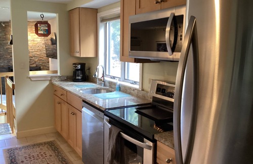 Our second bedroom is located on the main floor and has twin beds that are made up as a king. They may be separated as twins. The kitchen is fully equipped with all stainless steel appliances- range, microwave, refrigerator and a dishwasher. And more pots and pans than you might want to use on a vacation. There is also a slow cooker for do-ahead meals.
