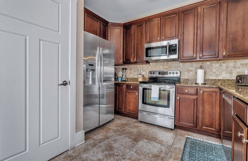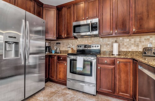 -Fully-equipped kitchen with dishwasher, coffee maker, blender, mixer, crockpot, waffle iron, ice maker.