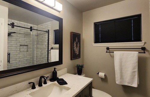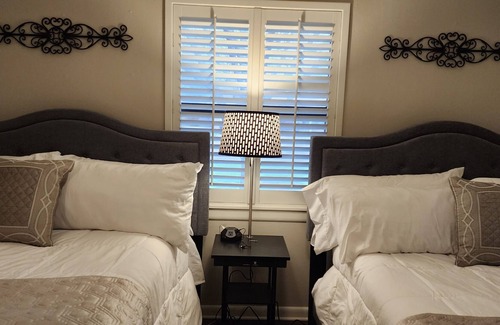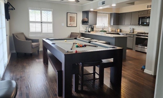 Step inside this cozy, 3 bedroom, Dallas bungalow and experience city living in a quiet Dallas neighborhood. The house is a short 15 minute drive to DFW and Love Field Airports. The location can't be beat! You can be anywhere in the metroplex in 20 minutes or less. Guests love the comfort of the living area which includes 2 couches, a dining table, a 60' tv, a comfortable chair and a fireplace for cold winter evenings. Enjoy a game of pool or darts while whipping up a gourmet meal in the kitchen, which opens up to see all the action in the game area .The pool table converts into a dining table which comfortably seats ten . There's extra seating at the kitchen counter and a small seating area next to the table. Don't worry about a larger family, this house sleeps 8 comfortably. Out back, you can enjoy the gas BBQ grill on the beautiful flagstone patio, while sitting at the umbrella shaded table, or playing a game of cornhole. Start your day with a fresh cup of coffee or tea, the fully equipped kitchen has everything you need to cook your own breakfast, lunch or dinner. The master suite has an adjacent full-size bathroom, and a 55'tv to relax and enjoy your favorite movies. Need a workstation? The middle room has a comfortable full-size desk and a day bed, which converts to two twin size beds. The 1g internet comes in handy too! The 3rd room is equipped with 2 queen beds and its own tv. All rooms come with luggage racks, ceiling fans, and full-size mirrors for getting ready. Don't worry about over packing your suitcase, there's a full-size washer & dryer, along with laundry detergent for all your cleaning needs. Want to stay in for the evening for a family game night? Enjoy a plethora of games and books, located in the game room closet. You're minutes from literally any cuisine imaginable. Check out our guide book for a list of local restaurants and entertainment.