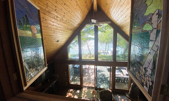 Spiral Sunset is a beautiful waterfront cottage on picturesque North Lake Leelanau with 4 bedrooms and 3 bathrooms that welcomes up to 10 guests. The home has a 2+ story vaulted ceiling with spectacular lake views.