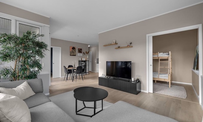 Gjør deg hjemme i denne moderne, velutstyrte leiligheten som ligger like utenfor hjertet av Tromsø. Med en ren skandinavisk design og alle bekvemmeligheter du trenger, er det den perfekte plassen å slappe av på etter en dag med arktiske eventyr.