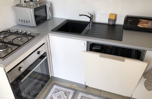 Living room, fitted kitchen, 2 bedrooms, large table, small terrace, dishwasher, washing machine, microwave, coffee maker, intercom ....