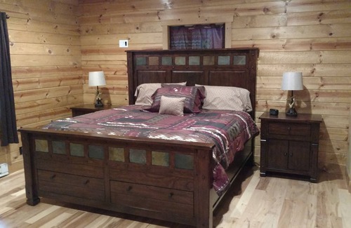 Enjoy all the amenities of a luxurious getaway, while tucked away in a charming log home. CUSTOM SET UP FOR CRAFTERS or a FAMILY/FRIEND GETAWAY. The atmosphere at Moonlit Lodge is a mountain experience the minute you walk in the door. Inside you will be pampered with a large open home with 3 large bedrooms and 2 1/2 baths, that easily accommodates 10 guests. The king suite, sleeps 2, upper bedroom with 1 king bed and 1 twin, and the unique bunk room sleeps 6. These are custom beds built into the walls, creating a cozy safe nook for sleeping! The loft has a queen sofa sleeper for additional sleeping room. A beautiful sunroom/ dining room is adjacent to the living area with access to the outdoor hot tub. Enjoy the covered front porch for morning coffee, while listening to the relaxing stream just a stones throw away. Enjoy the hot tub and fire pit, up until 10 p.m.*NO PARTIES* There is a noise ordinance - quiet time 10 p.m. - 8 a.m. you must move inside by 10 pm .Strictly enforced.